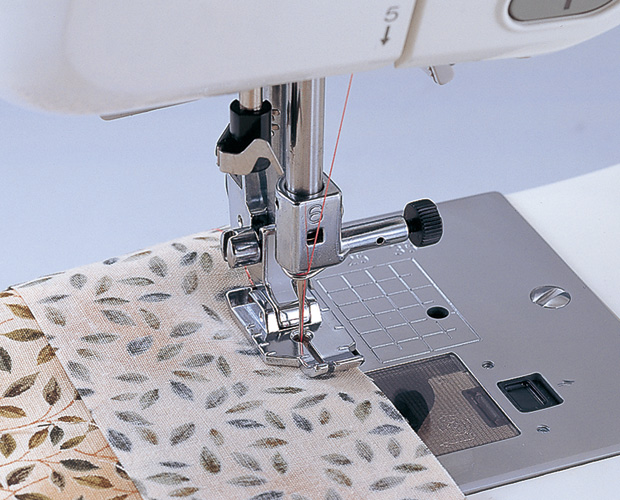 1/4インチ(6.4mm)のぬいしろで縫い合わせたい時は押えの右側に、